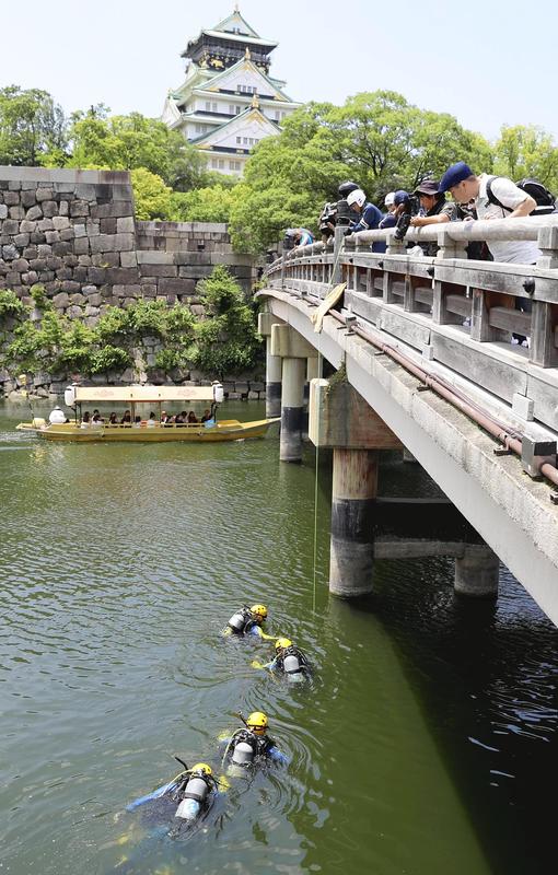 Osaka prefectural police officers search a moat at Osaka Castle on Monday, ahead of the G20 summit in Osaka on Friday and Saturday. As a related event is scheduled to be held at the castle, about 30 policemen scoured the 3-meter-deep inner moat for suspicious objects.