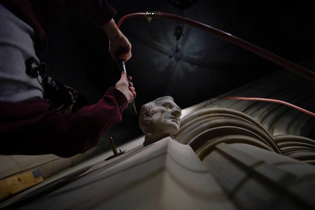 During an early April visit to the cathedral by The Associated Press, Callahan was putting the finishing touches on the carving about 10 feet (3 meters) above the floor.