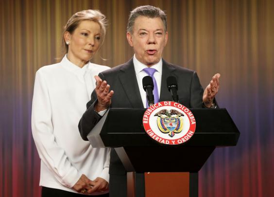 “I invite everyone to join our strength, our minds and our hearts in this great national endeavour so that we can win the most important prize of all: peace in Colombia,” Ms Santos said, standing alongside his wife.