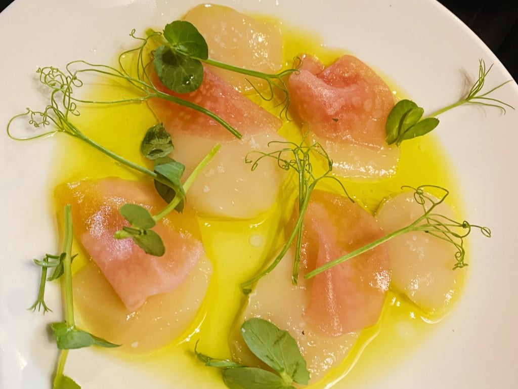 Onto the food. The starters were a triumph. Comte beignets with pickled walnut ketchup were salty, fatty and absolutely moreish – I could have eaten 10. Wafer-thin slices of Sopressa all’Amarone were a delight to peck on. Braised bobby beans were listed as coming with black olives but instead arrived with meaty nocerella olives and covered in breadcrumbs for a gratifying element of crunch. A dish described as “slipsole in smoked butter” was simply divine – fleshy, creamy fish that fell away from its delicate skeleton, swimming in a butter that seemed to have been infused with a spice reminiscent of harissa. Isle of Mull scallops were supersized; finely sliced, doused in olive oil and topped with pickled turnips that brought a bracing dose of acidity. The winner, however, was the ham hock and chicken terrine. It was paired with a briny piccalilli the colour of Homer Simpson that made a welcome partner to the robust flavours of the meat. It was the kind of starter you could eat three times over.