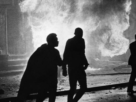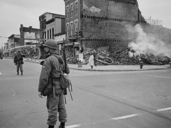 Hundreds of blazes left vast avenues of burning wreckage and nightmare scenes of desolation. The air was filled with smoke and the smell of tear gas, and the streets were littered with broken glass and tumbled-down bricks, as if in the aftermath of an air raid. Stretches of the city resembled combat zones, and 13,000 members of the Army, Marines and National Guard were brought in to regain control.