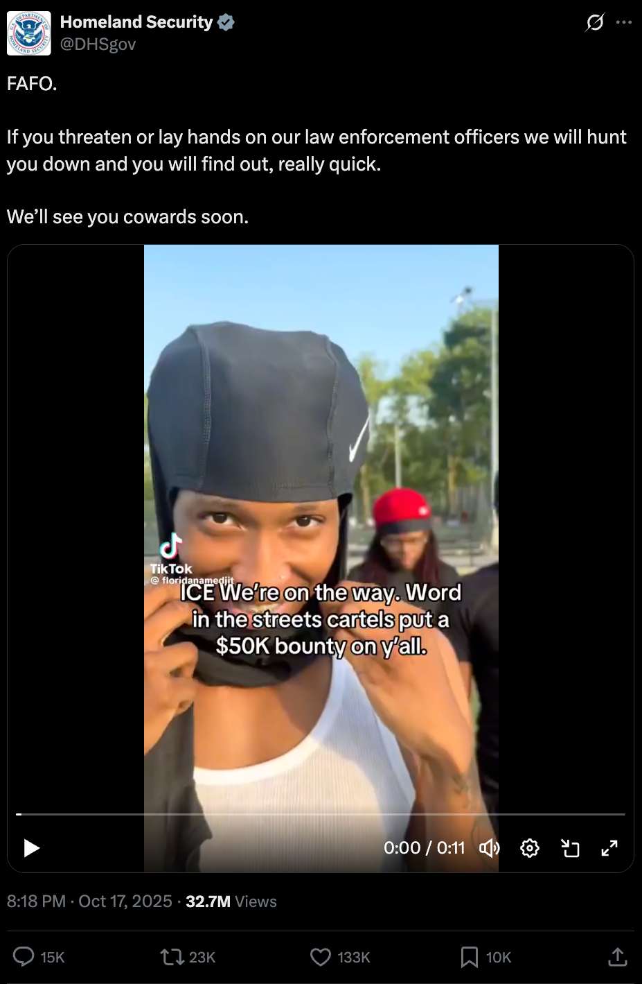 “DHS did not edit, change, use AI, or in any other manner or form alter this video. It was downloaded directly from this individual’s account on Friday, October 17th after it had already acquired over 40,000 likes and hundreds of comments urging individuals to target our ICE officers.