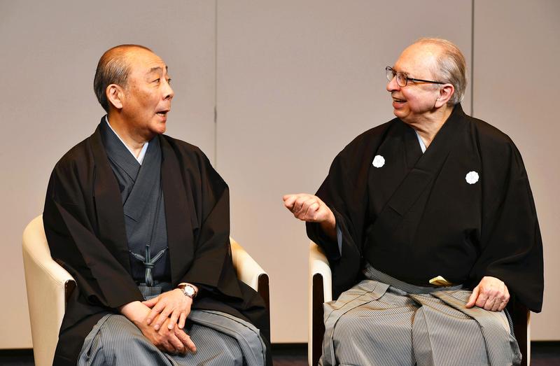 Emmert is a noh scholar from the United States, who first came to Japan nearly half a century ago. Asami is a noh actor of the Kanze school of noh, who specializes in playing shite, or lead roles. In the past, they appeared in similar events abroad, with Emmert giving a lecture and Asami performing.