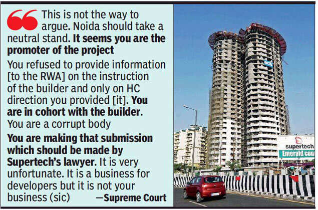 NEW DELHI: The Supreme Court on Wednesday slammed the Noida Authority as a “corrupt body” for supporting and toeing the line of builder Supertech with regard to two housing towers that are said to be illegal constructions.