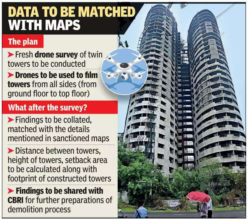 NOIDA: A drone survey would be carried out to gather measurements and data about the twin towers in Supertech Emerald Court whose demolition has been ordered by the Supreme Court.