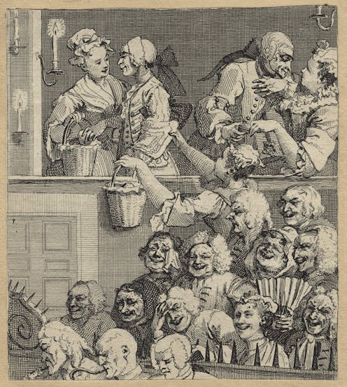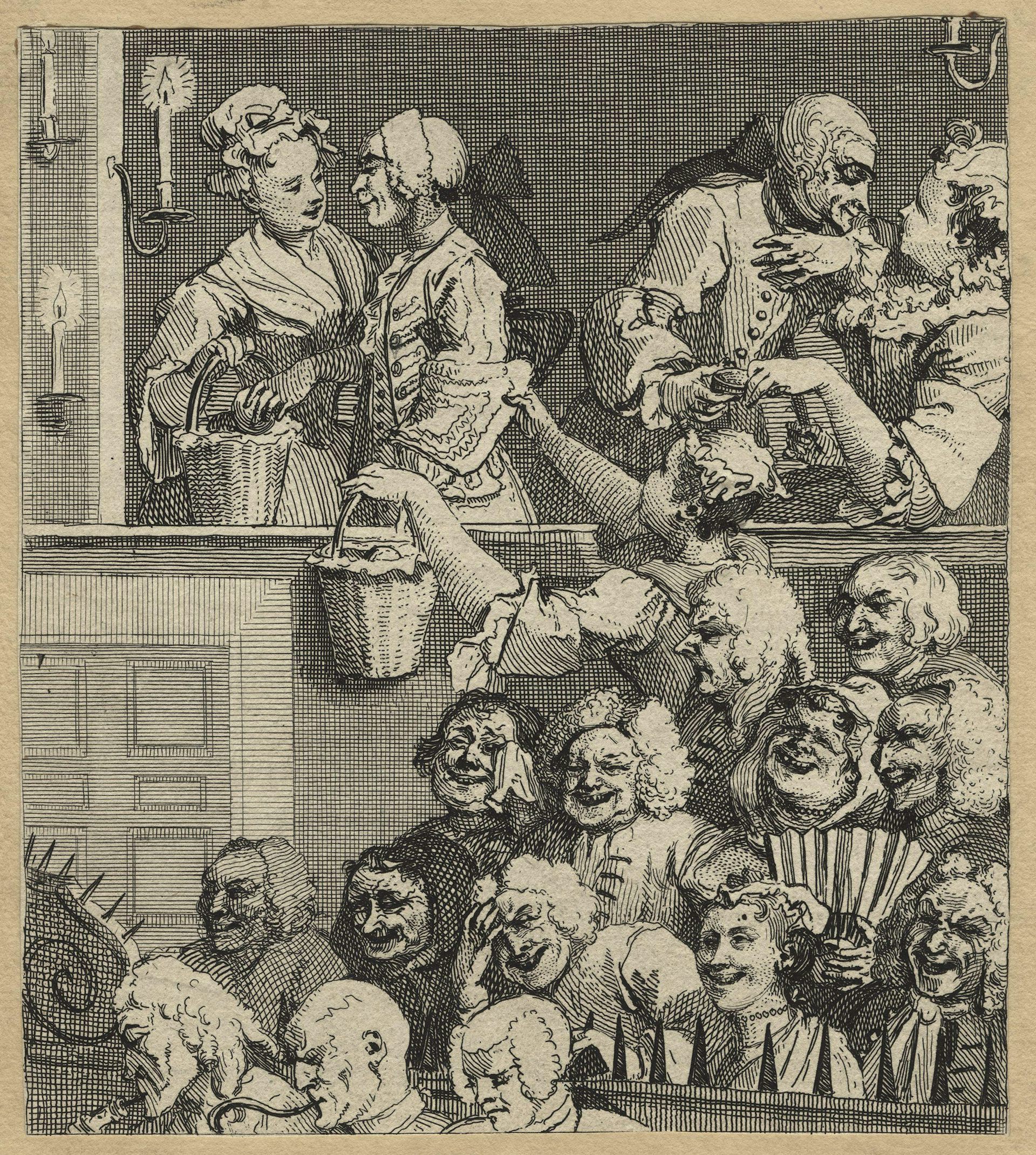 While the two patent theatres established a degree of control over audience behaviour, it would be several decades before British audiences would become relatively silent witnesses in the auditoria. Charles Dickens satirised theatre’s noisy atmosphere in Great Expectations (1860/1861), exposing amateur “roscian” Mr Wopsle to the taunting humour of the “debating society” in the gallery, whose “general indignation” at the performance took “the form of nuts”. The throwing of food, among other choice objects, was a risk that actors frequently faced. Dickens’ satire here is aimed at poor performances as much as the audience in the cheap seats (at this time, housed in the gallery).