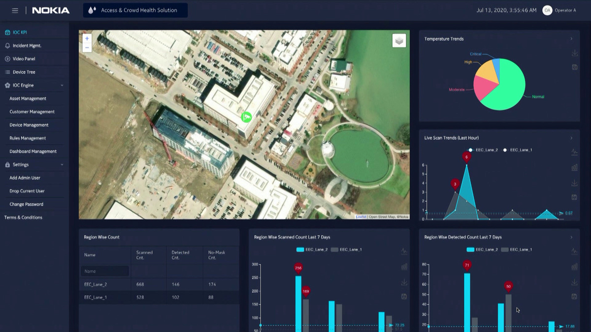 Nokia has created an automated system that uses a thermal camera and real-time video analytics to determine if a person has COVID-19 symptoms and is wearing a mask, part of efforts to protect employees as they return to work.