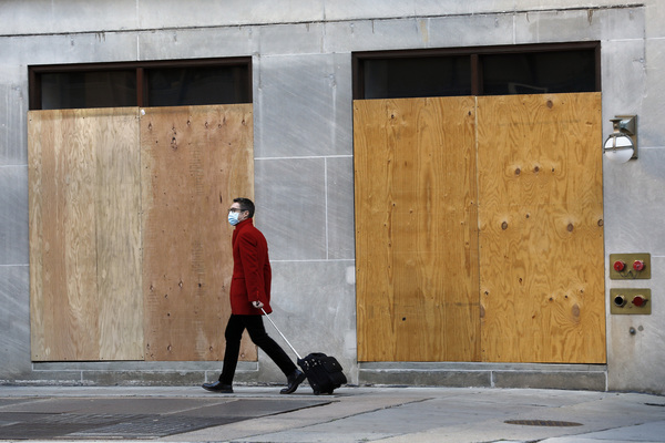 A man walks past windows covered by plywood near the White House the day before the presidential election on Monday, Nov. 2, 2020 in Washington, D.C. (Yuri Gripas/Abaca Press/TNS)