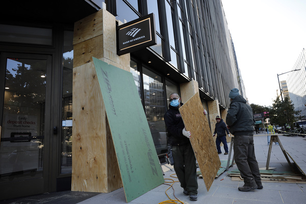 Workers place plywood over Bank of America windows near the White House the day before the presidential election on Monday, Nov. 2, 2020 in Washington, D.C. (Yuri Gripas/Abaca Press/TNS)