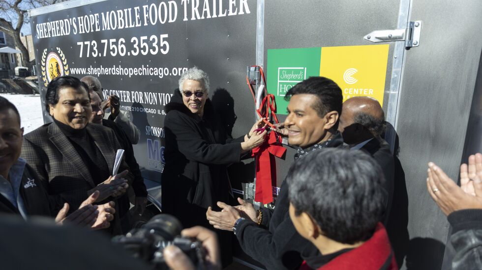 The launch of the nonviolence center on Wednesday also marked the beginning of the group’s mobile food pantry, which will visit the homes of those who cannot go to the food pantry themselves and deliver goods. The 14-foot trailer allows the food pantry to be on the go throughout the streets of Englewood.