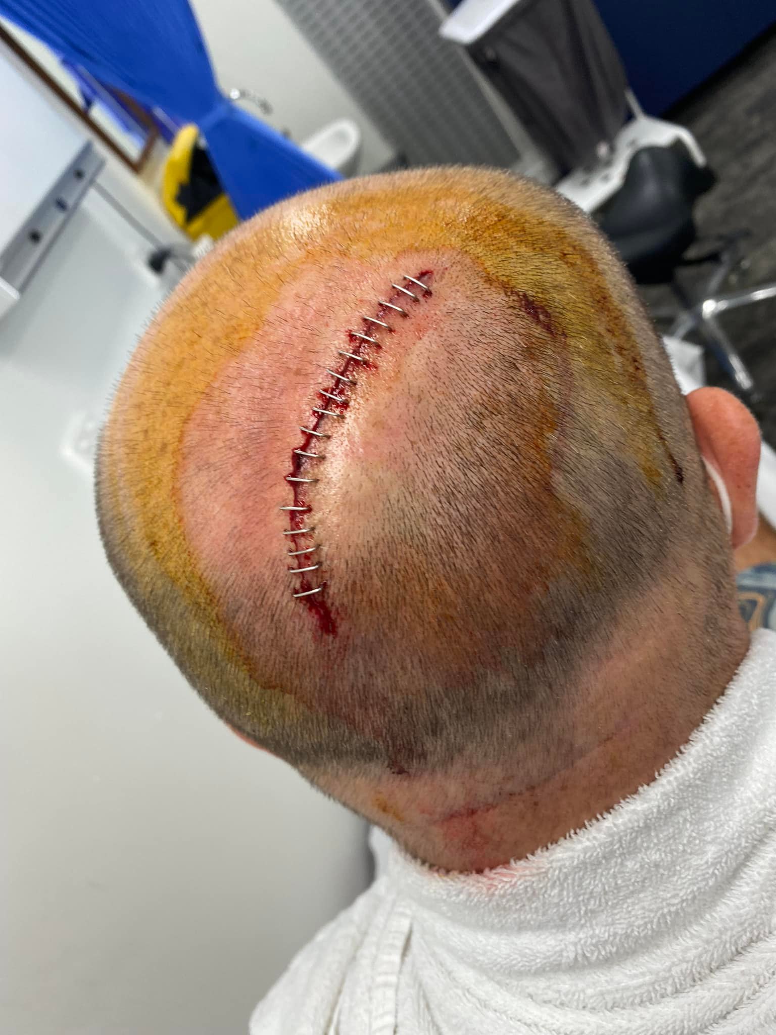 Derek Symons required 17 staples in the back of his head after being run over by a surfboard in the waves at Noosa National Park on Sunday.