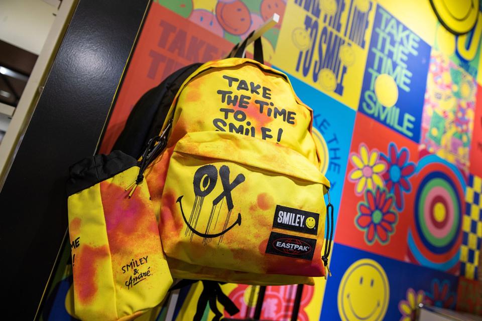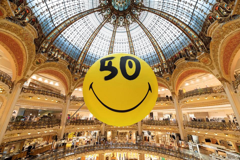 The Smiley Company collaboration with the Galeries Lafayette department stores opened February 21, and includes a giant art installation in the flagship Paris store on Boulevard Haussmann, featuring graffiti artist Andre Saraiva’s take on the Smiley logo. There also is a Smiley-themed skate-boarding ramp outside the store, and a Smiley gaming area with original arcade games and virtual reality game consoles.