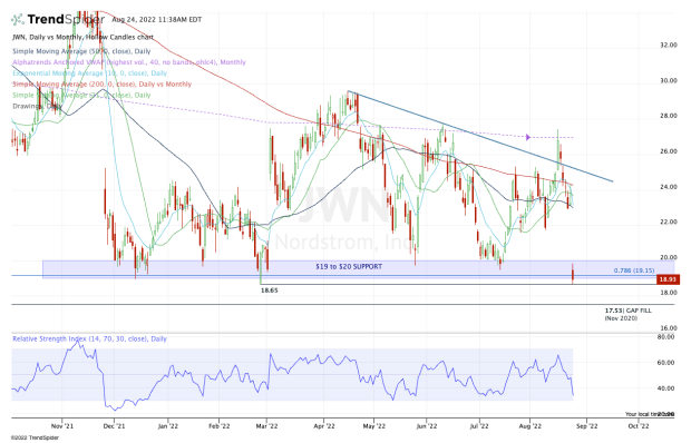 For Nordstrom, the stock is on the cusp of losing a key support zone in the $19 to $20 range. As highlighted below, this zone has been support all throughout 2022.