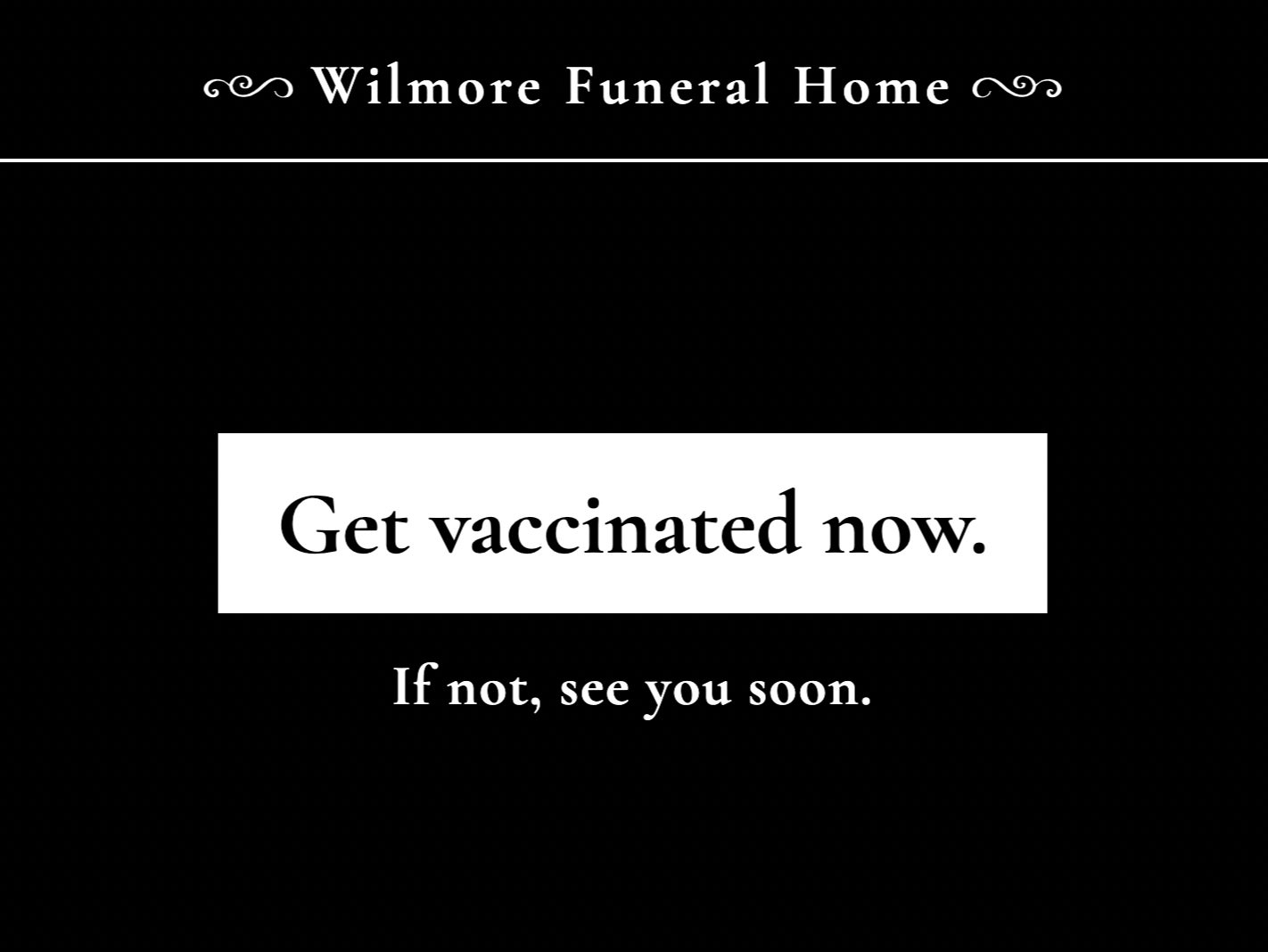 The “funeral home” website advertised on the vehicle, wilmorefuneralhome.com, is actually online, but only consists of a landing page that reads — rather ominously — “Get vaccinated now. If not, see you soon.” Clicking “get vaccinated now” then re-directs visitors to StarMed Healthcare’s COVID-19 registration page.