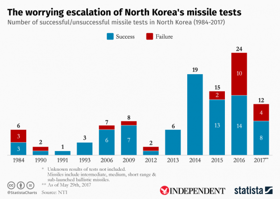 The infographic below, created by statistics agency Statista for The Independent, shows the escalating pace of the Kim regime's missile testing.