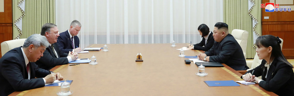 North Korea's state newspaper, Rodong Sinmun, featured eight photos of the meeting on its front page, including shots of Kim and Pompeo smiling and shaking hands, as well as some with Kim's sister Kim Yo Jong.