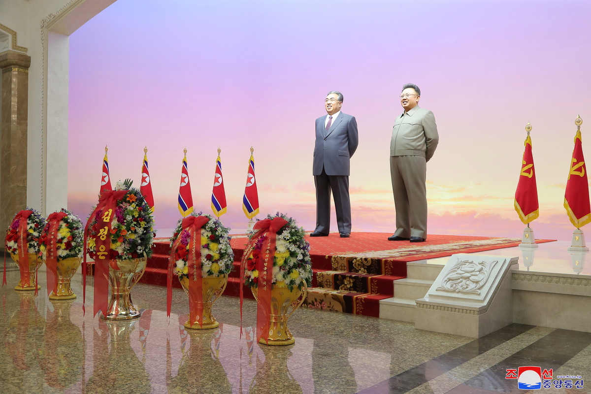 Kim and his wife, Ri Sol Ju, also watched a performance of song and dance at the Kumsusan Palace of Sun, where his father and grandfather lie in state, in celebration of the national holiday, KCNA reported on Friday.