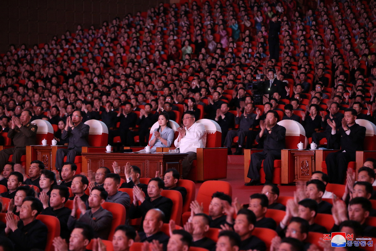 North Korean leader Kim Jong Un and his wife, Ri Sol Ju, watch a performance in celebration to mark the birthday of his grandfather Kim Il Sung, in Pyongyang, in this photo supplied by North Korea's Korean Central News Agency (KCNA) on April 16, 2021. KCNA via REUTERS
