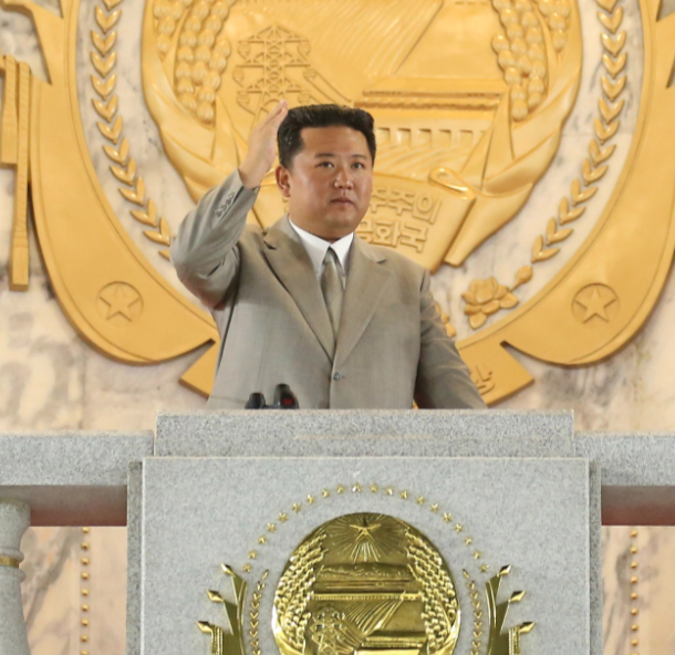 Dressed in a light-colored suit, Kim didn’t make a speech. But he waived, smiled and gave a thumbs up as thousands of goose-stepping paramilitary and public security forces marched for about an hour through central Kim Il Sung Square in Pyongyang, fixing their gazes to the balcony where the leader was watching as they passed.