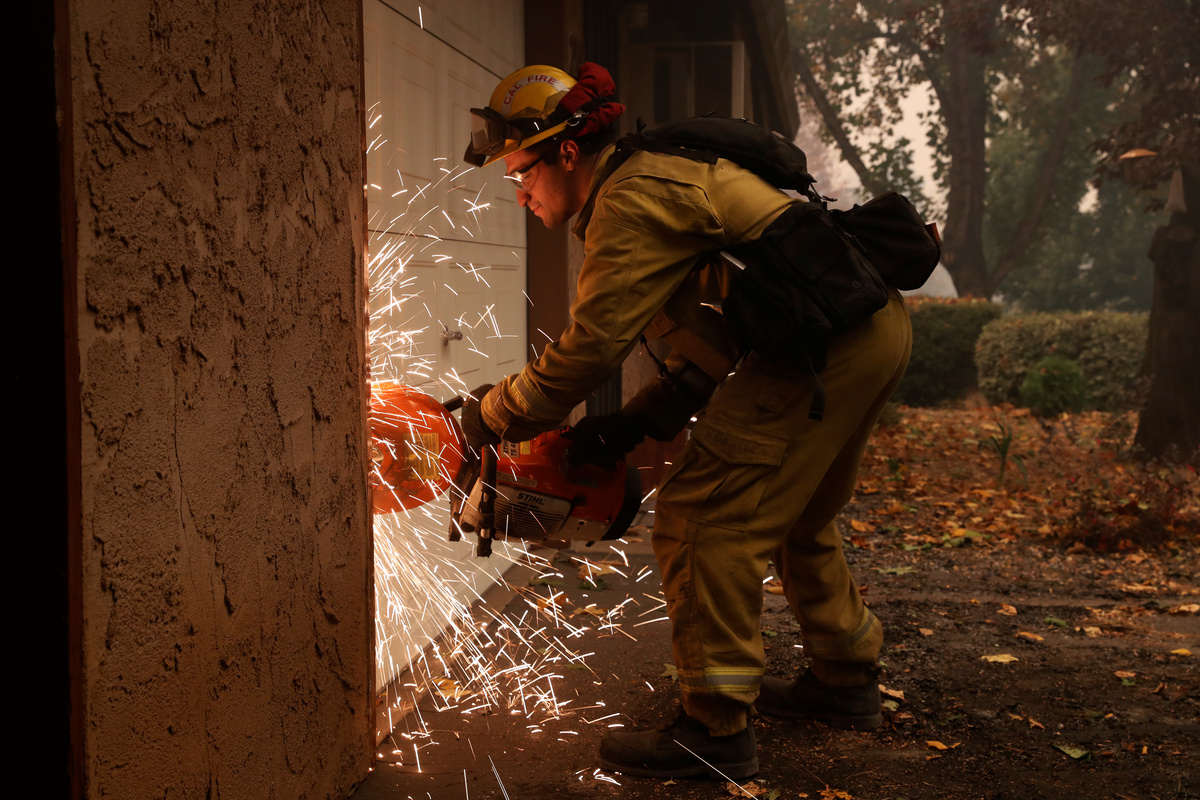 As of Saturday afternoon, the Camp Fire had blackened more than 100,000 acres (40,500 hectares) at the edge of the Plumas National Forest. Crews had cut containment lines around about 20 percent of the blaze.