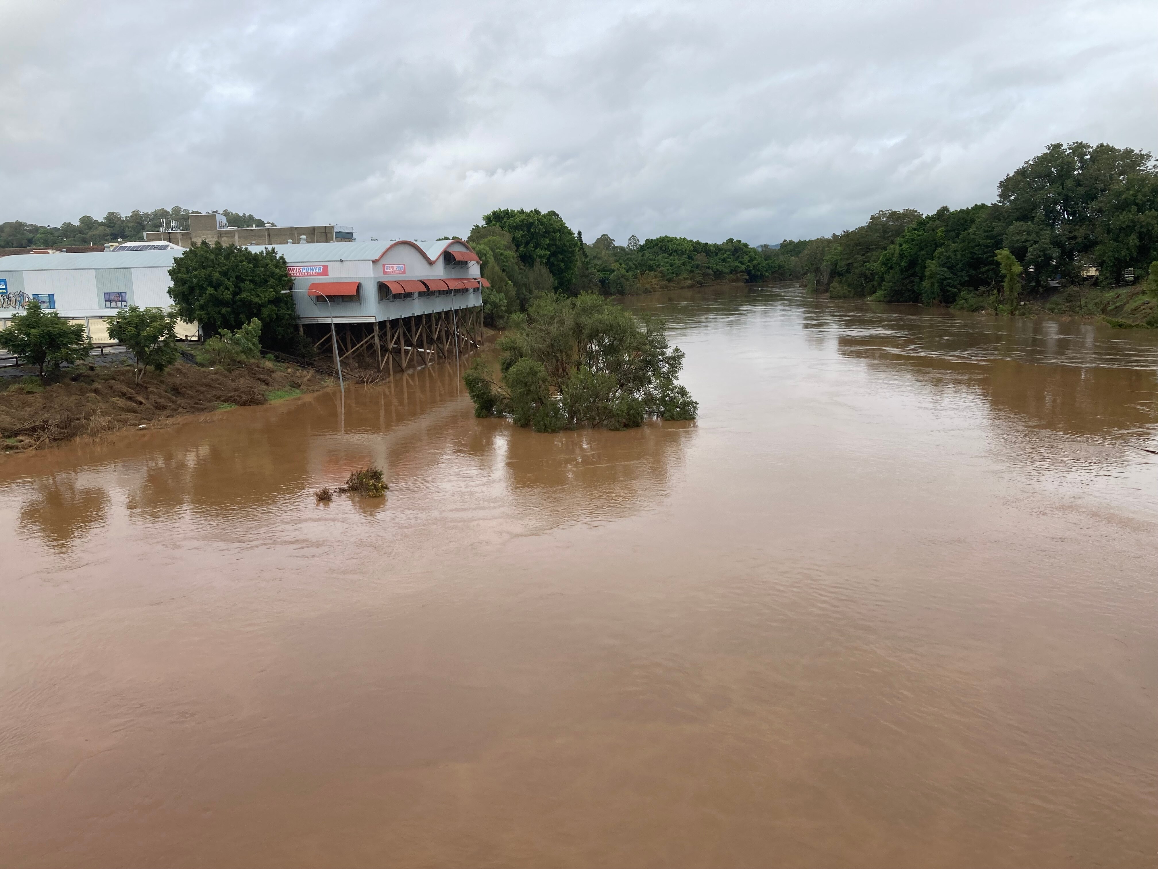 The Wilsons River broke its banks on Tuesday morning, with the BOM predicting the river would reach a peak of 8.4m at Lismore (revised down from 10.6m) at 8pm, below the town's 10.6m levee.