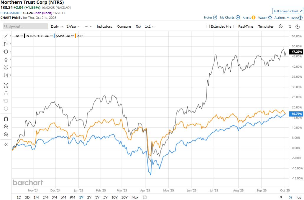 NTRS stock prices have soared 50.7% over the past 52 weeks, notably outperforming the S&P 500 Index’s ($SPX) 17.6% gains and the Financial Select Sector SPDR Fund’s (XLF) 18.2% surge during the same time frame.