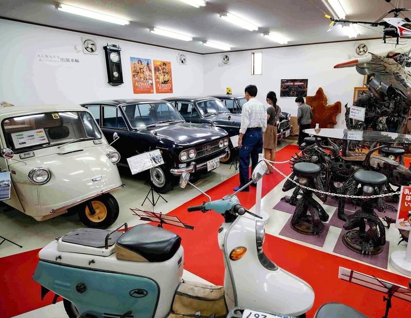 Pass through the gate and you're greeted by famous old cars. Among the popular models are the Ford Thunderbird beloved by U.S. President John F. Kennedy and the 1965 Hino Contessa, as well as three-wheel trucks and the Subaru 360, both of which were widely used by the general public.