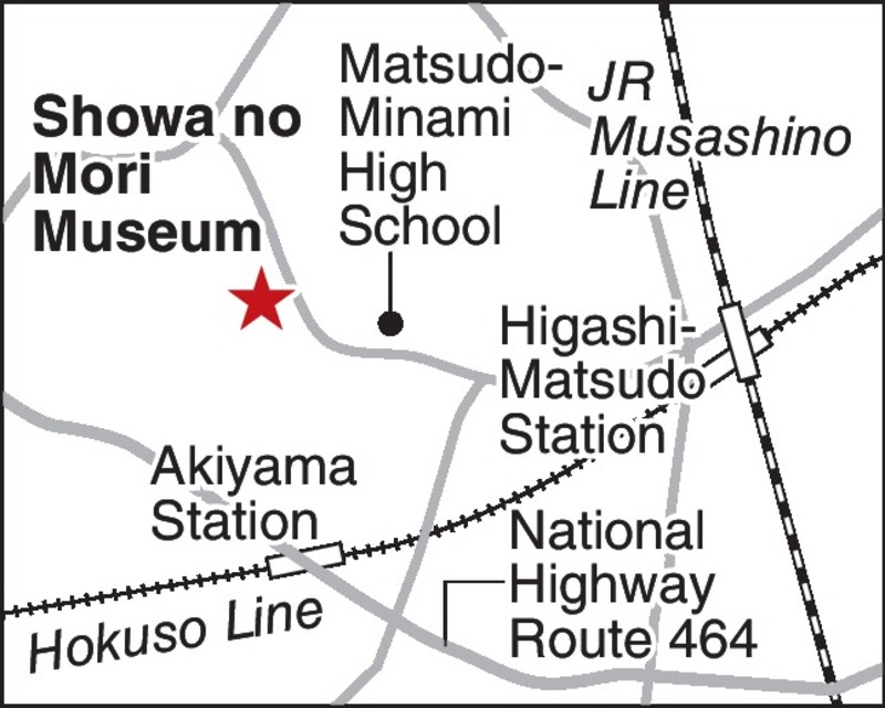 MATSUDO, Chiba -- A three-wheel truck drives along a dusty unpaved road, and a middle-aged deliveryman wearing a tank top rides a bicycle. Crowds of people watch TV in the street, and a red phone rings at a cigarette shop. The Showa no Mori Museum in Matsudo, Chiba Prefecture, is alive with the atmosphere of the bygone Showa era (1926-1989).