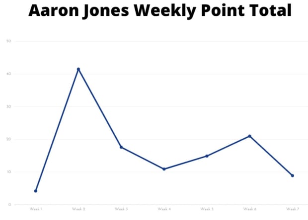 Jones’ graph spikes similarly to Henry’s, but it bottoms out much lower and much more frequently. The Packers running back averages 17 PPG and is RB11 in average scoring despite two games below 10 and two above 20. A 41.5-point, four-touchdown night certainly helps anchor you as a top scorer.