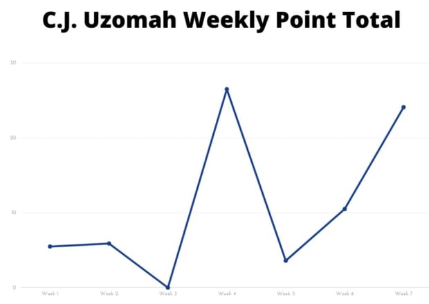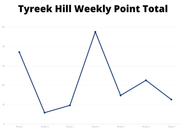 Chiefs speedster Tyreek Hill is just a few spots behind Kupp. He began the season with 37.1 points after going for nearly 200 yards against the Browns. Hill nearly broke the 200-yard mark a few weeks later again and added three touchdown receptions to finish with 47.1 points. In between those outings, however, Hill combined for just 15.6 points.