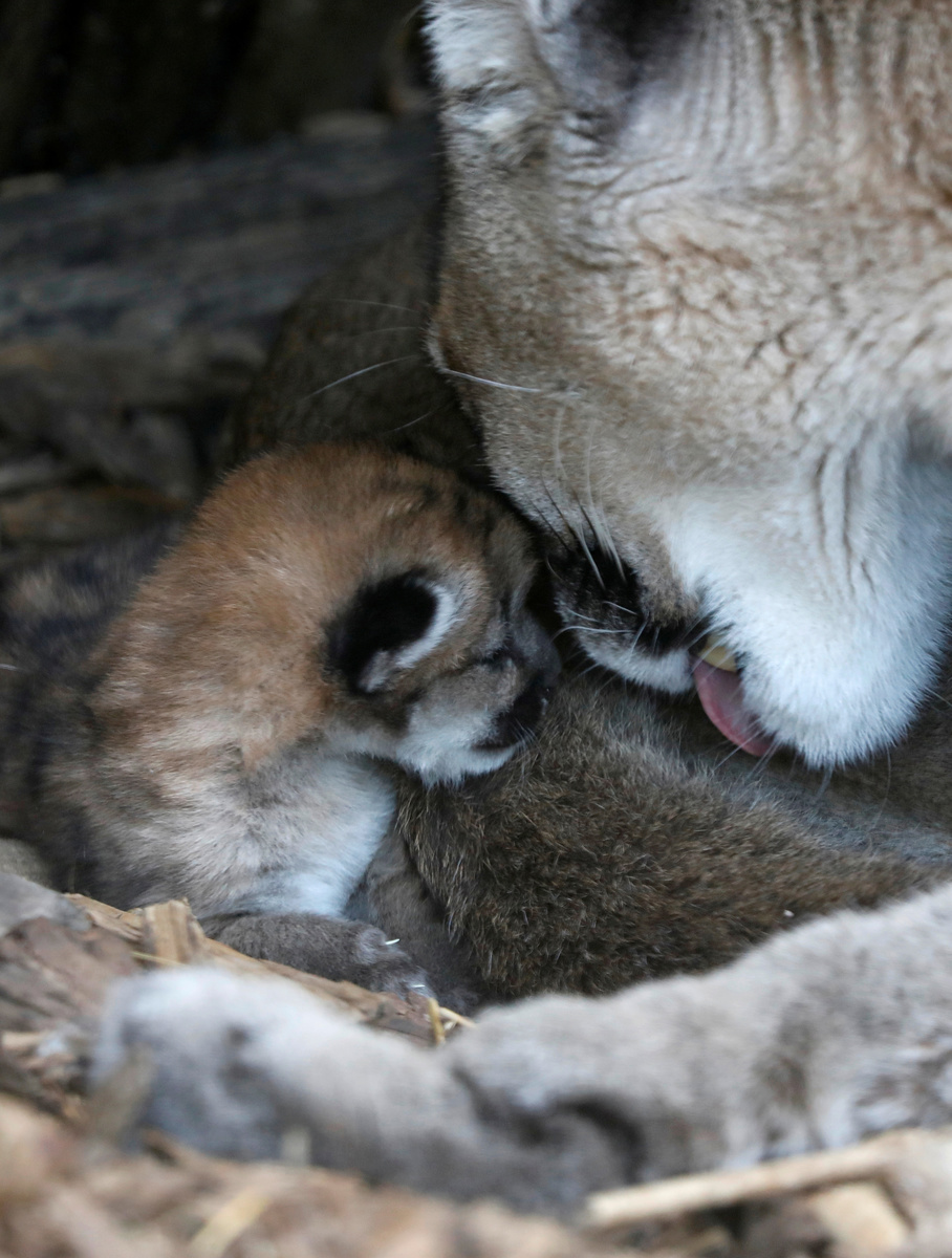 The baby puma was born on Aug. 21 in the viewing bay in front of zoo visitors. The little cat has not yet opened its eyes and is staying close to its 10-year old mother. Visitors are kept at a distance so as not to disturb the animals.