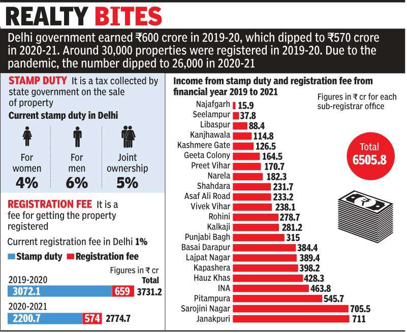 NEW DELHI: With the Covid-19 pandemic impacting the real estate sector, Delhi government has seen a considerable dip in the stamp duty collection. The revenue collected through the property registration fees has also declined since April 2020, with the government earning Rs 956.5 crore less in 2020-21 on both counts as compared to 2019-20.