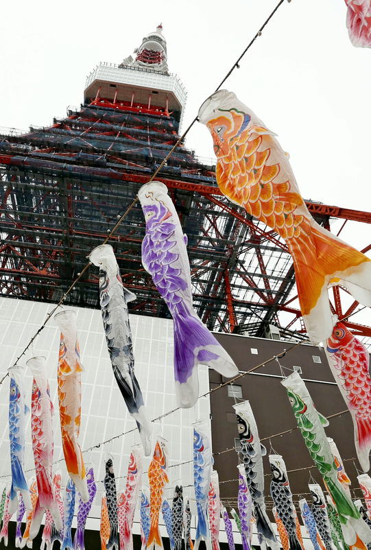 Koinobori carp streamers "swim" above the entrance to Tokyo Tower, in the capital's Minato Ward, on Friday, with 333 of the colorful decorations to match the iconic structure's height in meters. The 11th annual event at the landmark, which marks Children's Day on May 5, kicked off about one month earlier than usual to entertain an increasing number of foreign visitors. The event runs through May 6, with the carp streamers illuminated from 5 p.m. to 11 p.m. daily.