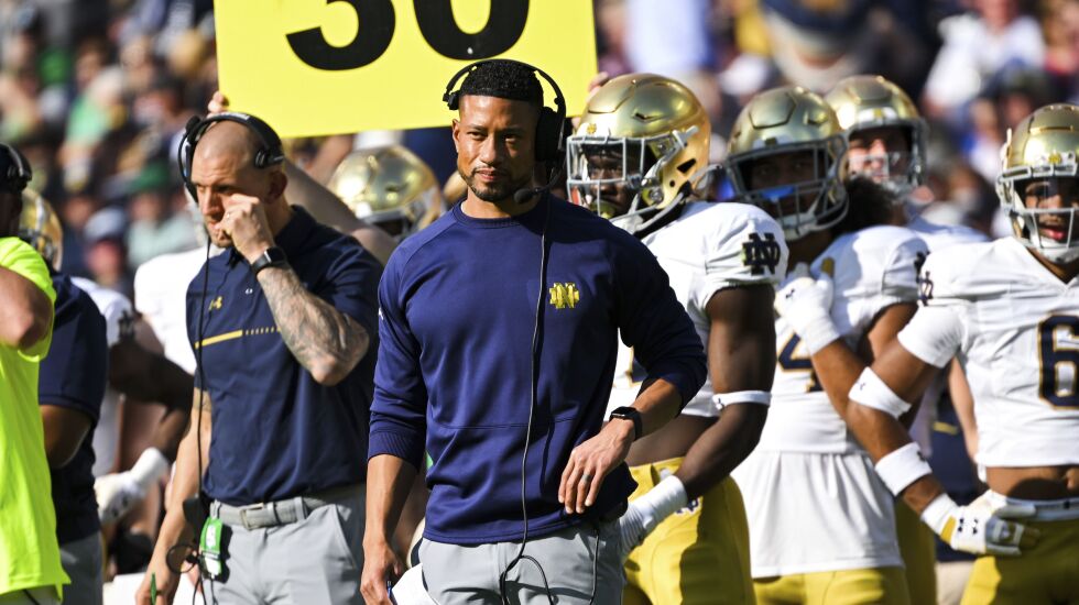 SOUTH BEND, Ind. — Marcus Freeman started his first full season as Notre Dame coach with a stumble and a fall.