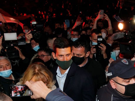Many of those in the crowd that gathered to celebrate with Djokovic were sporting masks, though many were not, and a large number were packed tightly together as they attempted to get close to the sporting icon, who wore a mask until he had taken to a stage to address his supporters.
