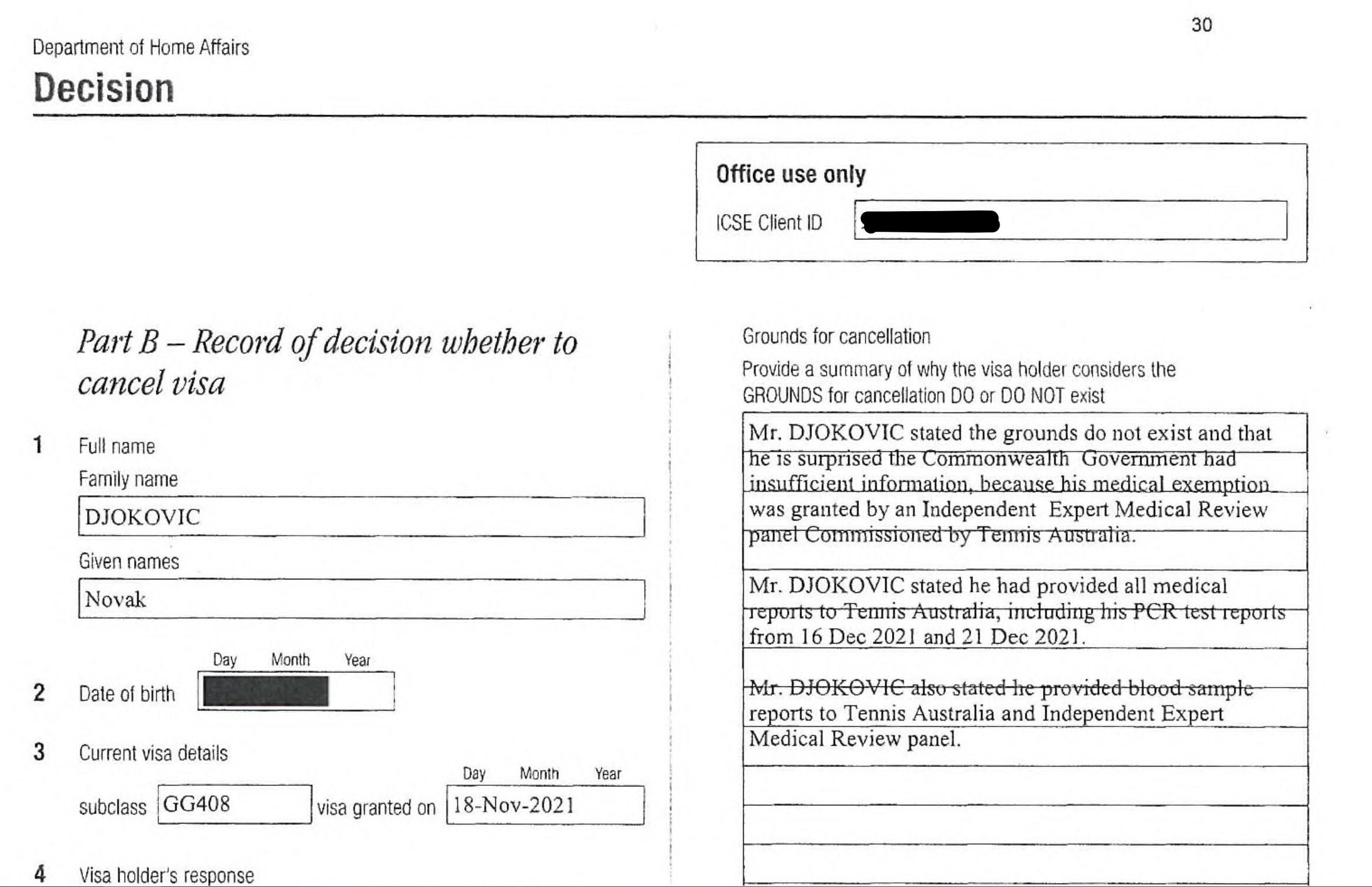 "Mr Djokovic stated the grounds do not exist and that he is surprised the Commonwealth Government had insufficient information, because his medical exemption was granted by an Independent Expert Medical Review panel commissioned by Tennis Australia."