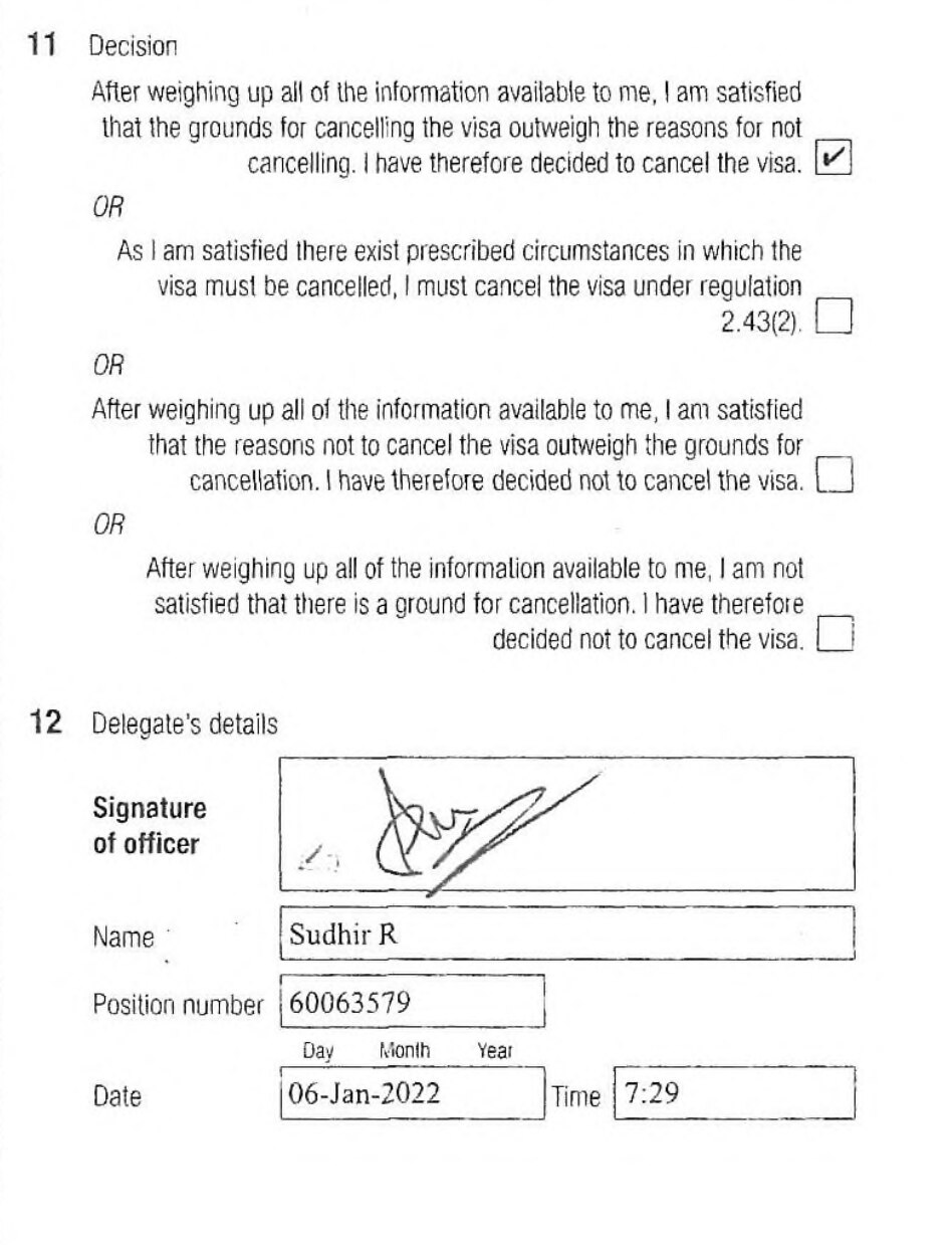 Then, according to documents, at 6:07 am began another interview detailed in the "record of decision whether to cancel visa" filed with the Federal Circuit Court.