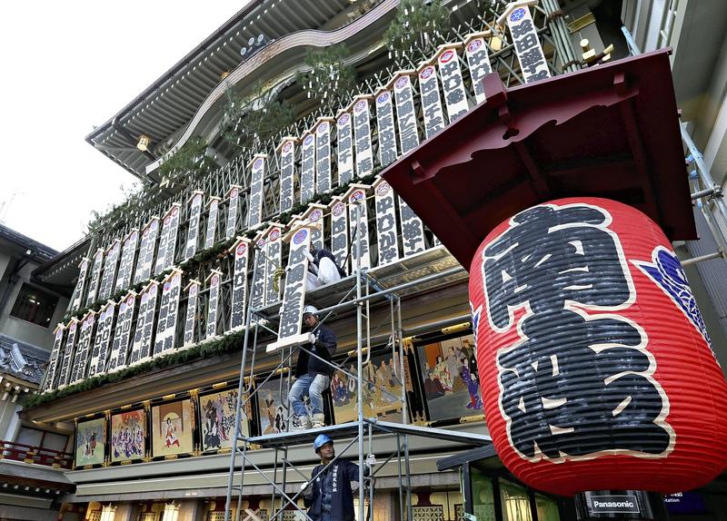 Workmen replace "maneki" plates with the names of kabuki actors above the entrance of the Minamiza Theatre in Higashiyama Ward, Kyoto, on Monday. The actors listed will appear in the December segment of the Kichirei Kaomise all-star event at the theater. Kichirei Kaomise is usually held only in December, but this year's show started on Nov. 1, marking the Minamiza's reopening after being closed for nearly three years for renovations.