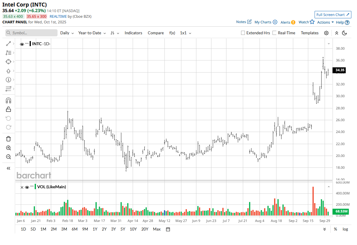 Intel shares have spiked 71% YTD and have far exceeded a wider S&P 500 Index ($SPX) that is up about 12% so far in 2025. INTC stock has ranged from a low of $17.67 to a high of $36.30 in a 52-week window and now is again nearing $36 and is up more than 14% just in the last half-dozen days of trading.