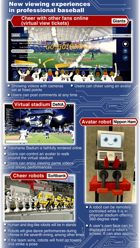 By remotely controlling the 80-centimeter-tall robot installed next to the third-base bench, baseball fans can see the pitcher on the mound and players on the bench, for example. They can also clap and talk with others on the screen.
