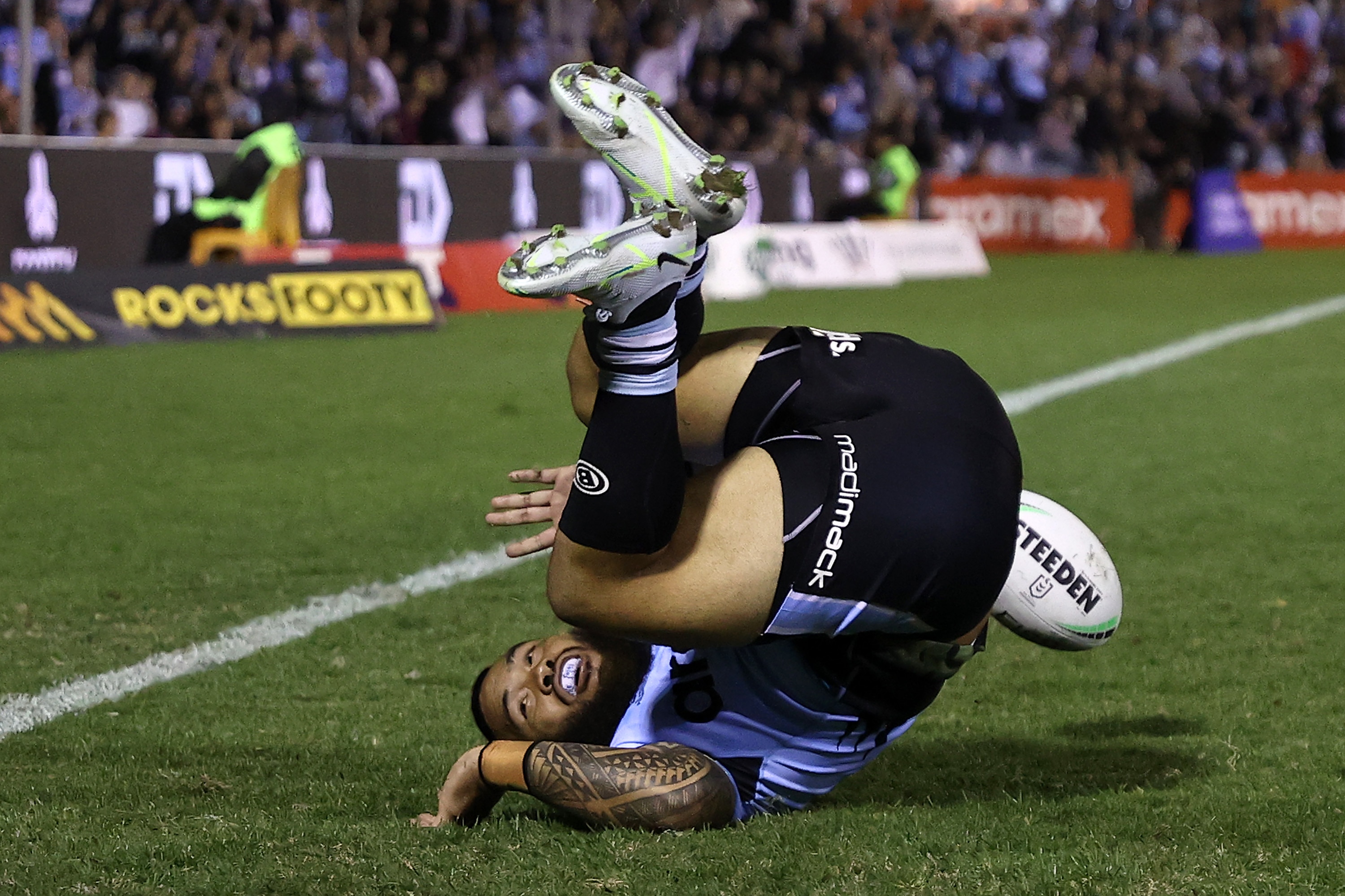 He appeared set for his hat-trick in the 20th minute when he powered to the outside again, but Harper and wing partner Jason Saab reined him in, only for the Shark to pop a miraculous ball out the back to Ronaldo Mulitalo to score.