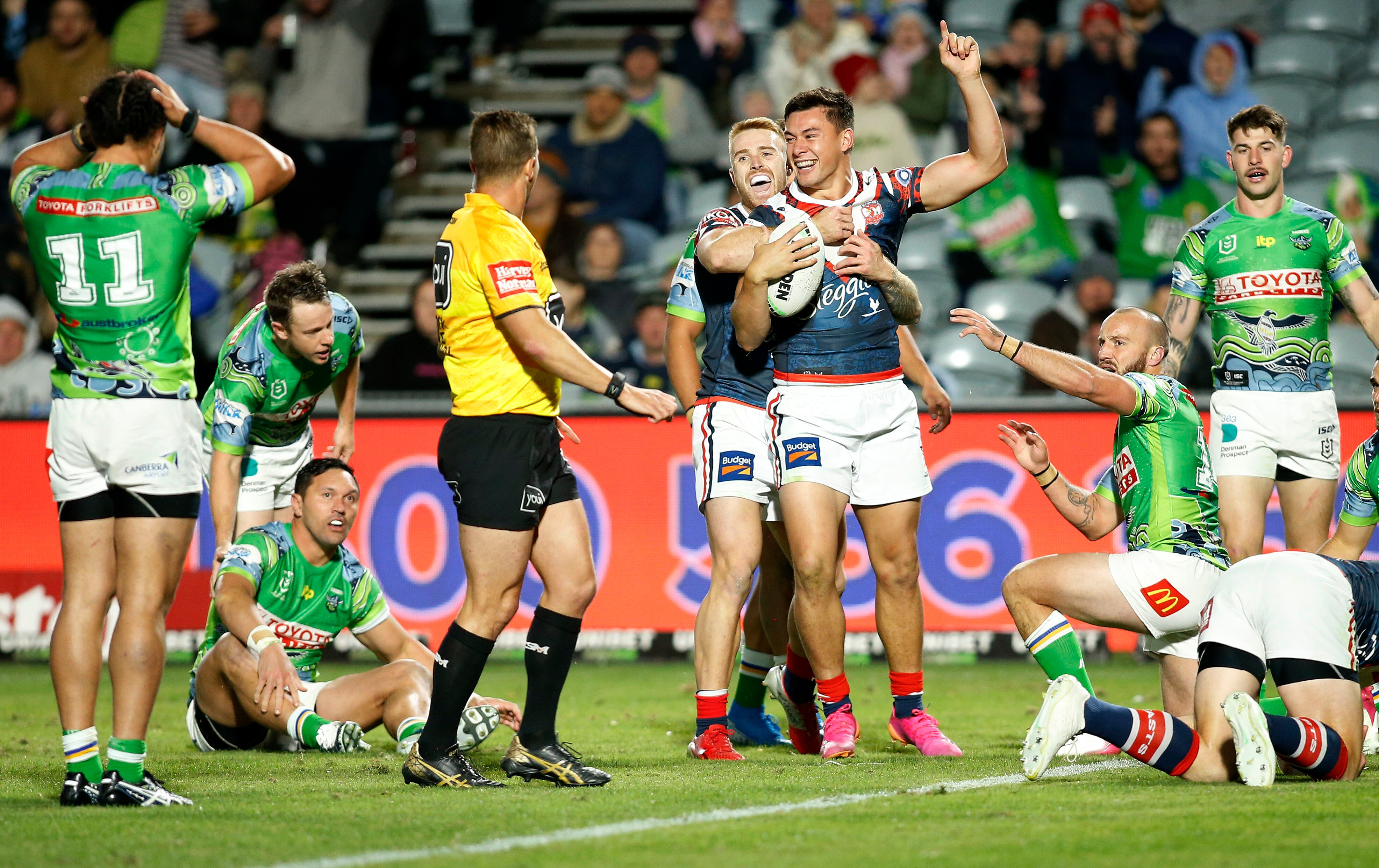 The Raiders, who have now lost seven of their past eight games, watched Daniel Tupou and Joey Manu extend the lead for the Roosters before eventually answering back through forward Ryan James, who was sin-binned in the first half for dropping a knee into Jared Waerea-Hargreaves.
