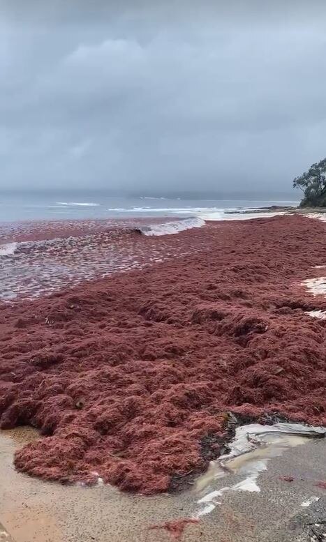 Marine biologists said the red seaweed was detached from the sea floor and washed up on the beach.