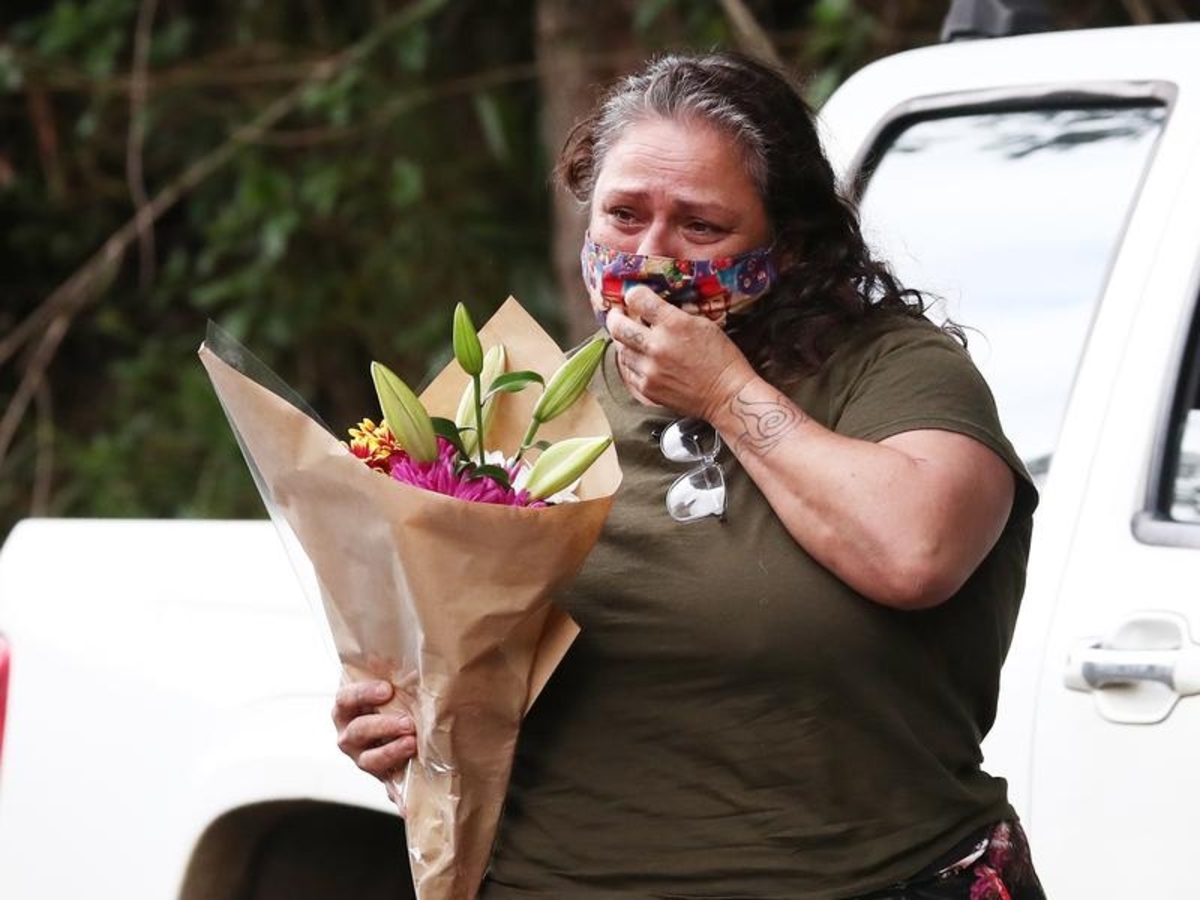 A bouquet of flowers was left outside the entrance to the property on Sunday afternoon with a note that read: "No words mourning with you."