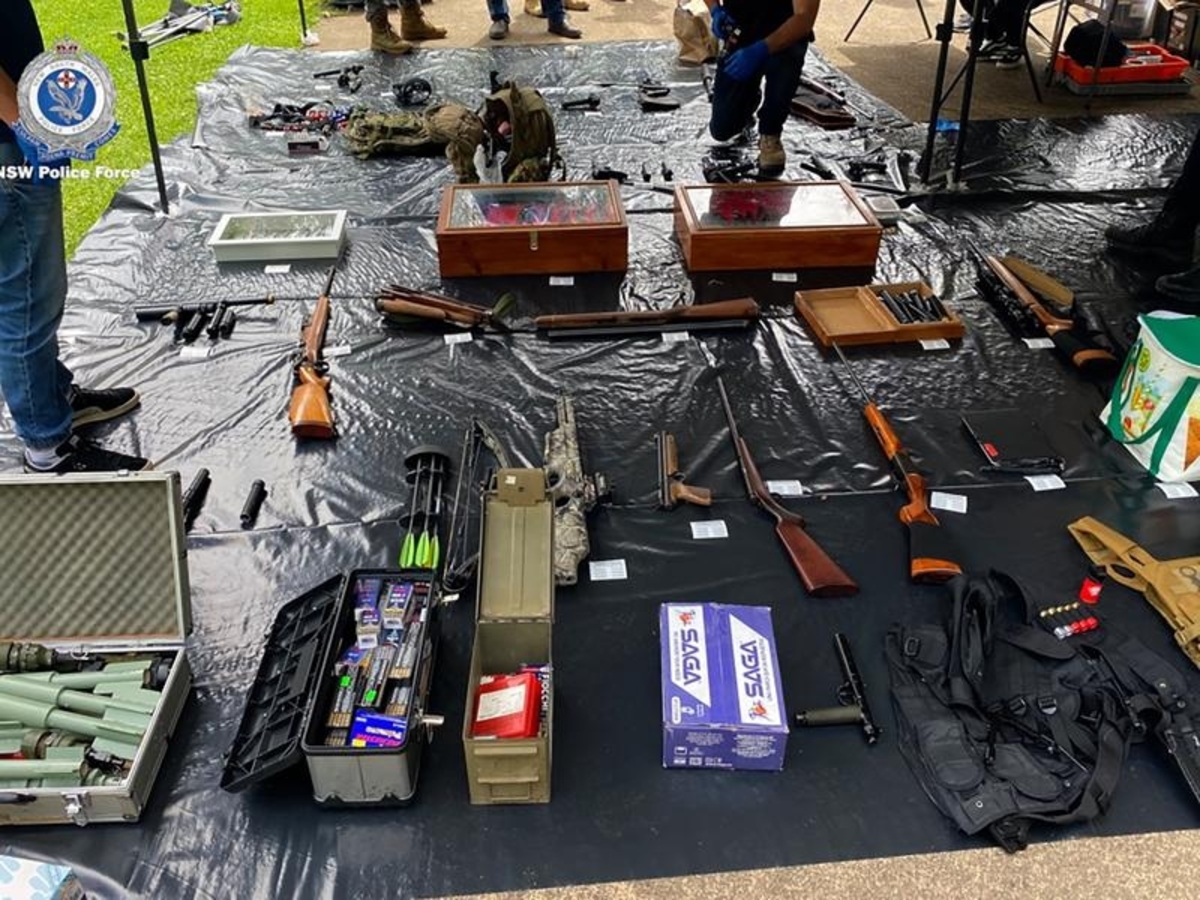 About 11am on Wednesday police raided a Kurrajong property where they seized 39 guns, 77 knives, thousands of rounds of ammunition, silencers, improvised explosives and the chemicals to make more.