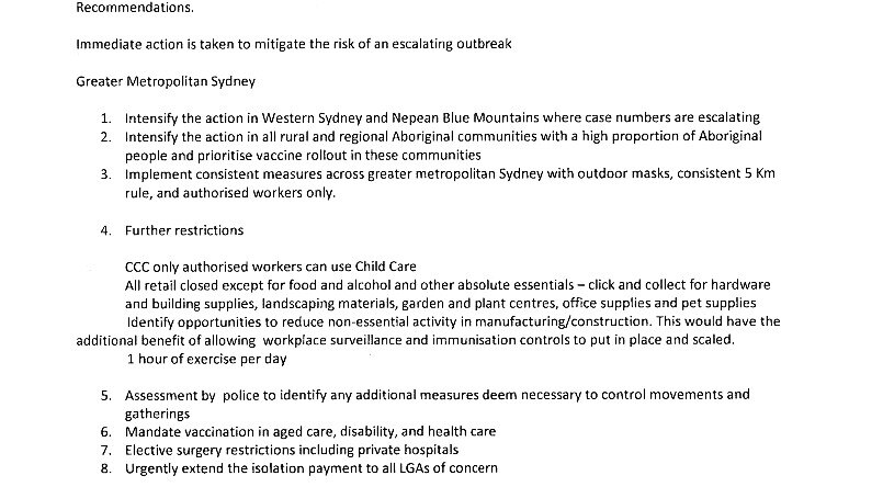 In it, Dr Chant recommends to "implement consistent measures across greater metropolitan Sydney with outdoor masks, consistent 5km rule and authorised workers only".