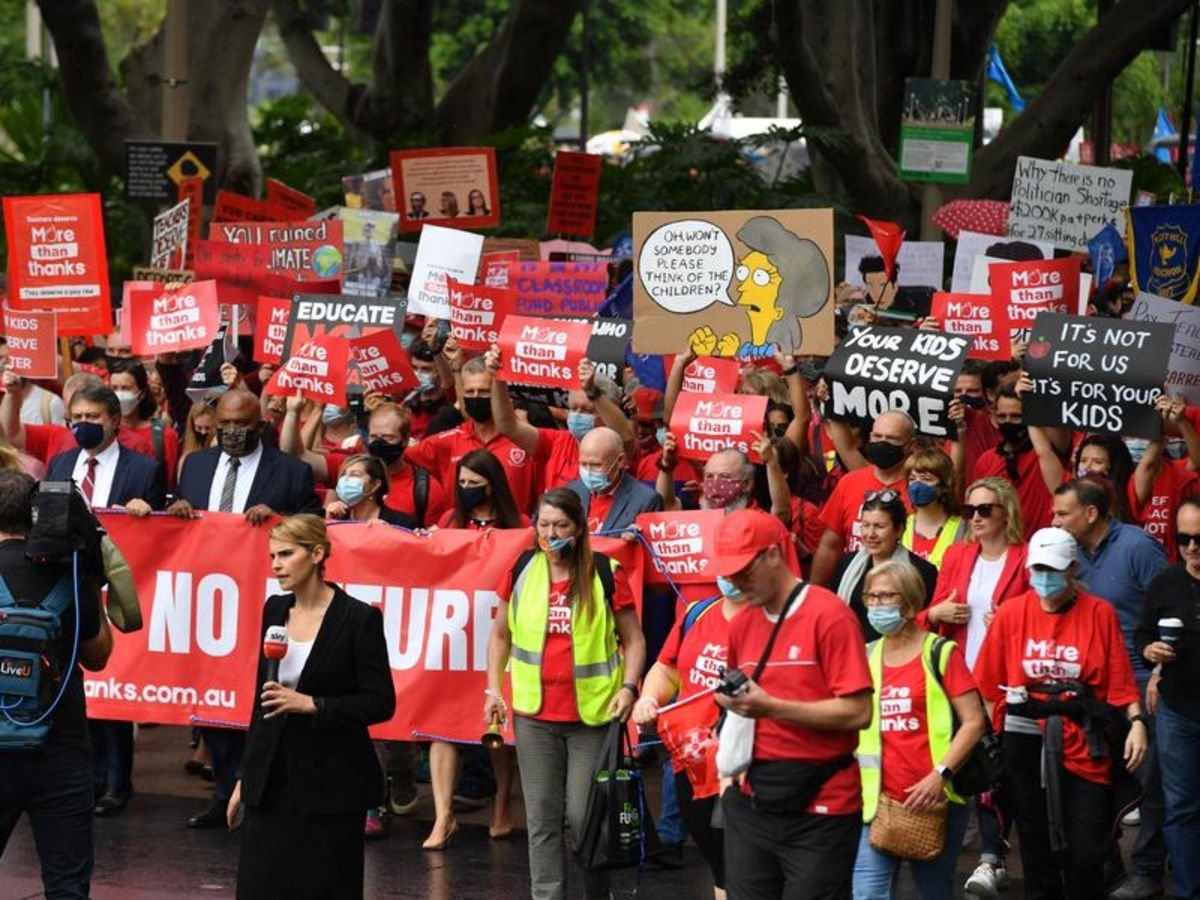 Teachers from Sydney, Newcastle, Wollongong and the Blue Mountains gathered at Hyde Park in Sydney's CBD on Tuesday, before marching to parliament where they filled a large stretch of Macquarie St.