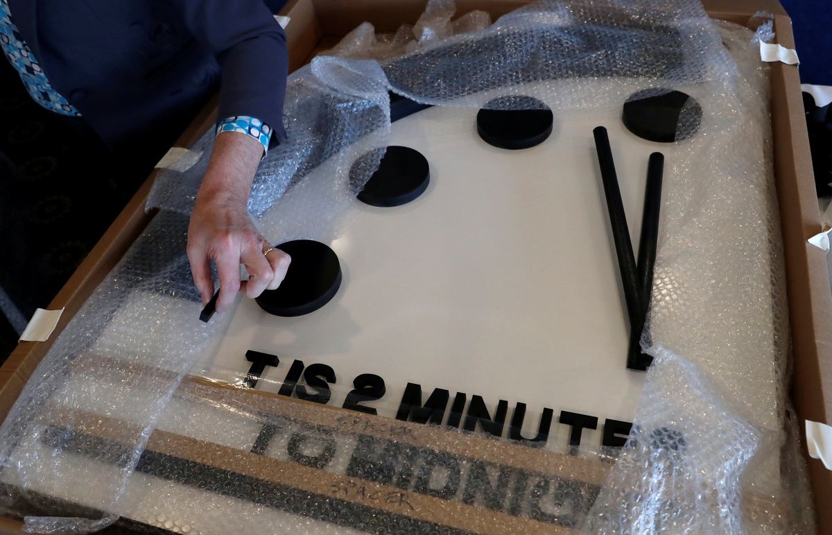 FILE PHOTO: Hilary Howes packs up the 'Doomsday Clock' after it was announced by the Bulletin of the Atomic Scientists that the hands have been moved to two minutes until midnight at a news conference in Washington, U.S. January 25, 2018. REUTERS/Leah Millis