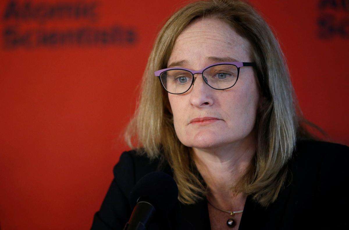 Rachel Bronson, president and CEO of the Bulletin of the Atomic Scientists listens to her fellow members talk about their decision to move the 'Doomsday Clock' hands to two minutes until midnight at a news conference in Washington, U.S. January 25, 2018. REUTERS/Leah Millis