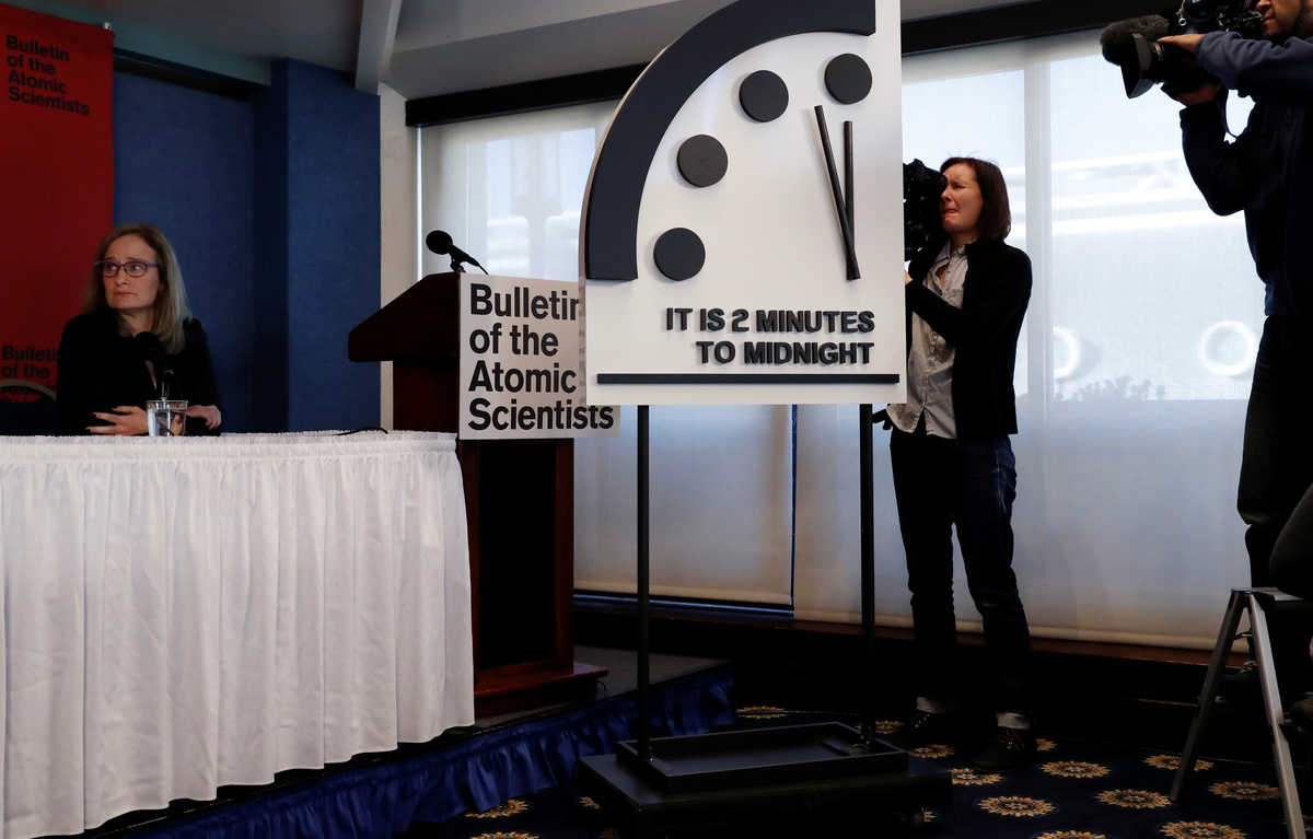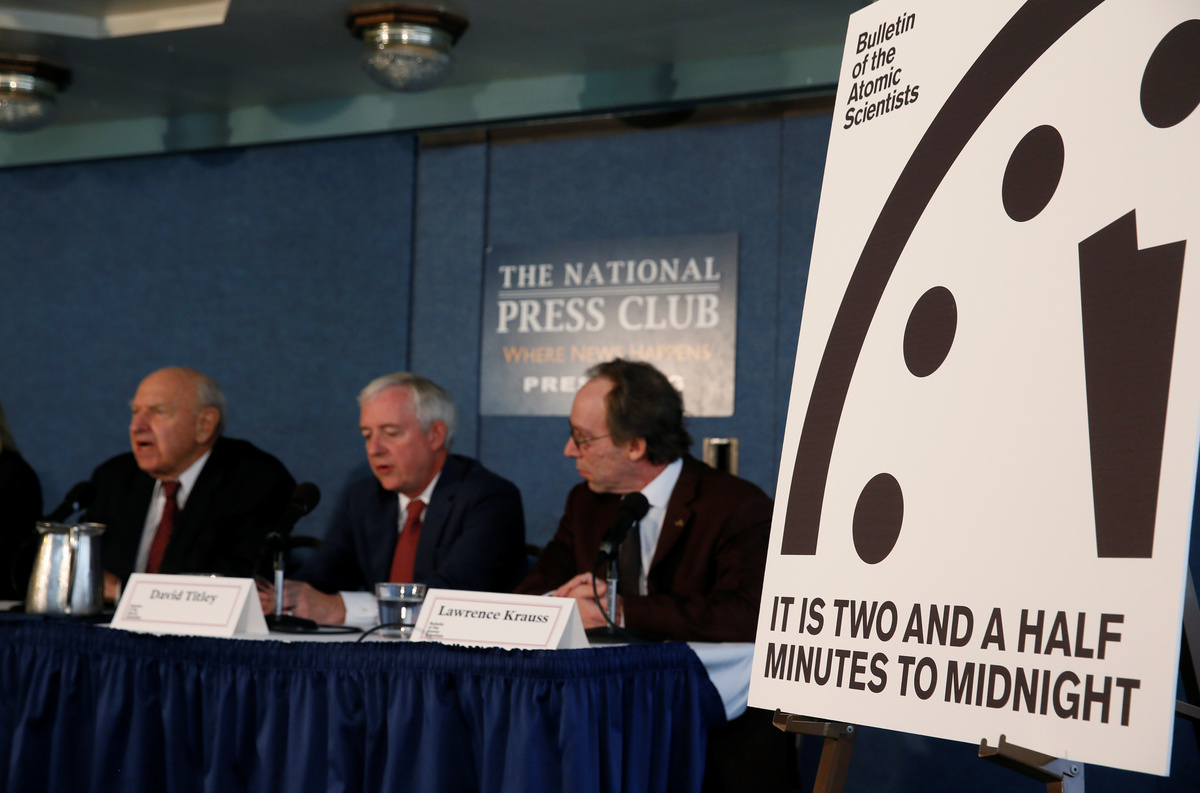 Robert Rosner, a member of the Bulletin of the Atomic Scientists, poses for a portrait after taking part in an announcement that the 'Doomsday Clock' hands have been moved to two minutes until midnight at a news conference in Washington, U.S. January 25, 2018. REUTERS/Leah MillisRachel Bronson, president and CEO of the Bulletin of the Atomic Scientists listens to her fellow members talk about their decision to move the 'Doomsday Clock' hands to two minutes until midnight at a news conference in Washington, U.S. January 25, 2018. REUTERS/Leah Millis"Bulletin of the Atomic Scientists" board members (L-R) Thomas Pickering, David Titley and chairman Lawrence Krauss speak at a news conference where the board revealed that it has moved the minute hand of their "Doomsday Clock" by 30 seconds to a more ominous 2-1/2 minutes from midnight at the National Press Club in Washington, U.S. January 26, 2017. REUTERS/Jim BourgSharon Squassoni listens to fellow members of the Bulletin of the Atomic Scientists talk about their decision to move the 'Doomsday Clock' hands to two minutes until midnight at a news conference in Washington, U.S. January 25, 2018. REUTERS/Leah MillisRobert Rosner listens to fellow members of the Bulletin of the Atomic Scientists talk about their decision to move the 'Doomsday Clock' hands to two minutes until midnight at a news conference in Washington, U.S. January 25, 2018. REUTERS/Leah MillisLawrence Krauss listens to fellow members of the Bulletin of the Atomic Scientists talk about their decision to move the 'Doomsday Clock' hands to two minutes until midnight at a press conference in Washington, U.S. January 25, 2018. REUTERS/Leah MillisRachel Bronson, president and CEO of the Bulletin of the Atomic Scientists listens to her fellow members talk about their decision to move the 'Doomsday Clock' hands to two minutes until midnight at a news conference in Washington, U.S. January 25, 2018. REUTERS/Leah Millis
